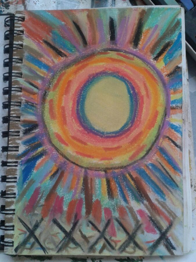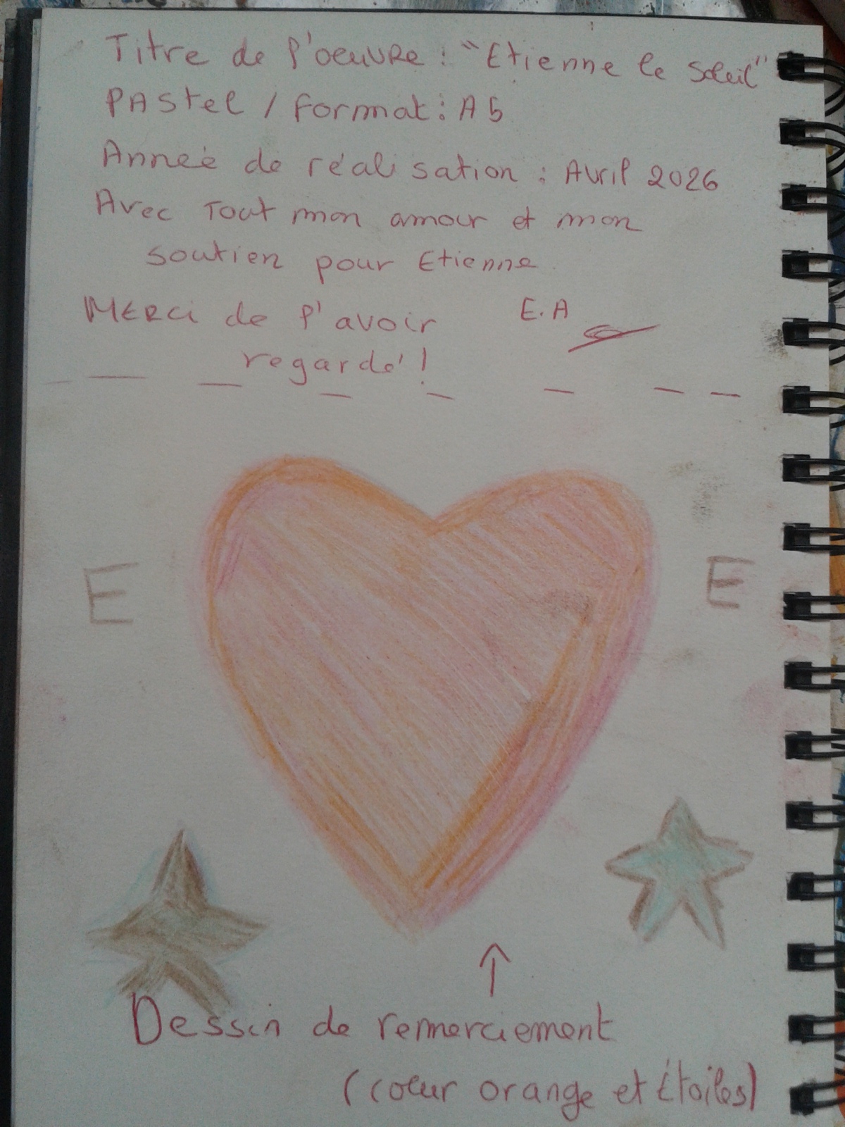 ça c'est la premiere oeuvre dans mon carnet d'art spécial pour Etienne - c'est un carnet qui va contenir des réalisations exprès pour lui à la pastel et peinture - c'est un carnet qui pourrait etre entre ses mains cette année ou plus tard - d'après une prédiction je vais peut-être laisser ce carnet sur son lieu de travail